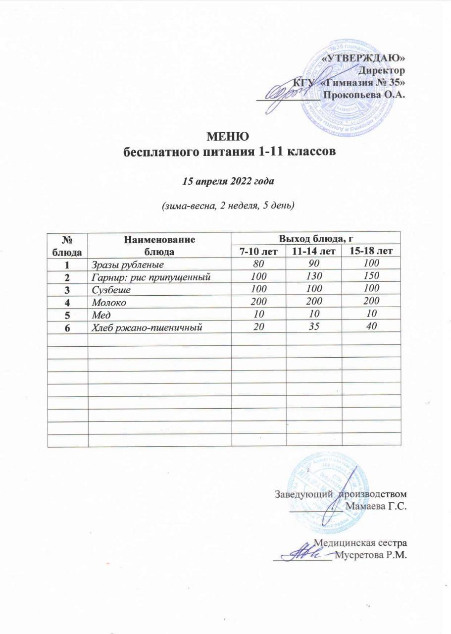 » МЕНЮ бесплатного питания 1-11 классов 15 апреля 2022 года